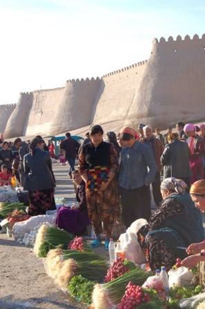 街の城壁。長さ2km、高さ約7m。5つの門を持つ。今は、24HrOpen。昔は開門/閉門時間があったんだろう。 オアシス都市は、どこも城壁で守られていた。主な敵は、騎馬民族だったかも。城壁内に動物は入れず、キャラバン隊は主に城壁の外に宿をとったそう。城壁の中にはいるには検疫があったようで、まずはお風呂に入らないといけない。
